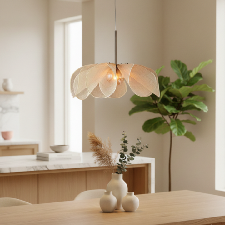 This pendant light features multiple curved shade panels arranged in a layered design around the central bulb. The structure is suspended from the ceiling and includes an adjustable cable for installation flexibility. It operates with standard LED bulbs and provides illumination suitable for indoor spaces.